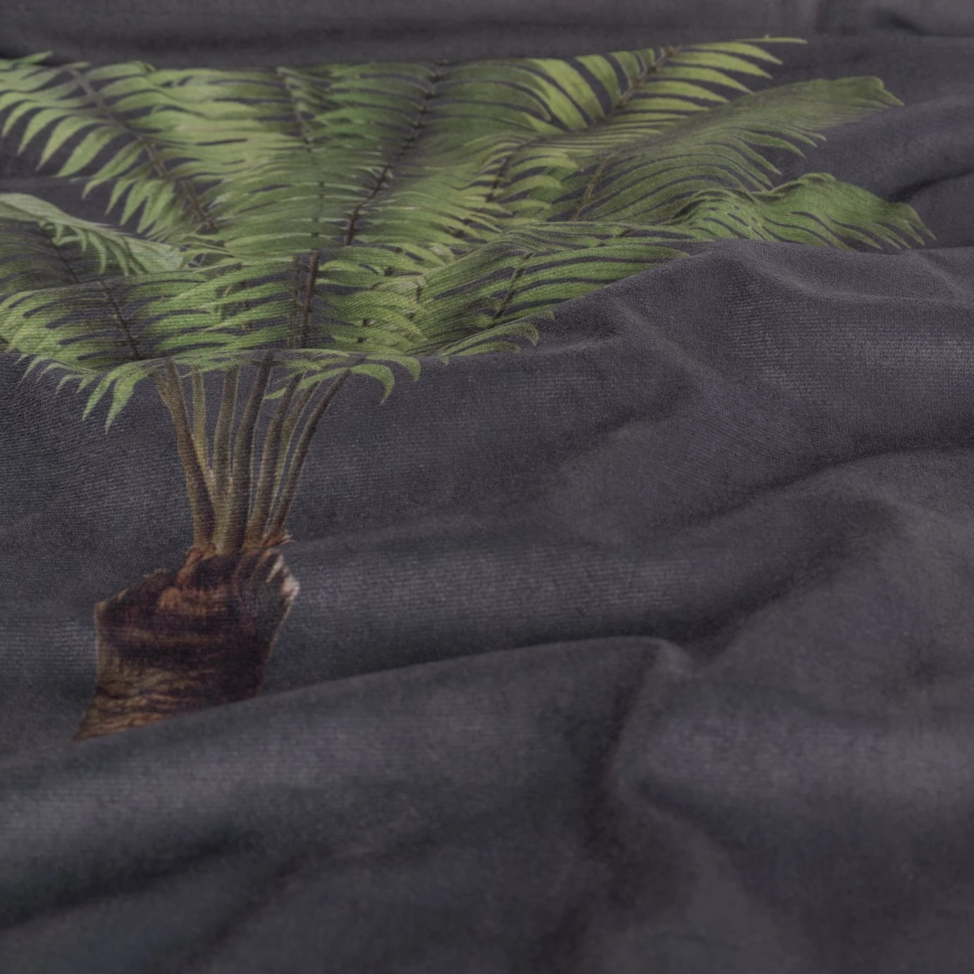 A palm fringed throw in the softest, lightweight velvet. Don't you just love the aesthetic? Deep greys and blacks printed with gorgeous, lush green leaves. Lined in 100% cotton, this tropical treat is also kind to skin. Exotic, stunning and totally luxe.