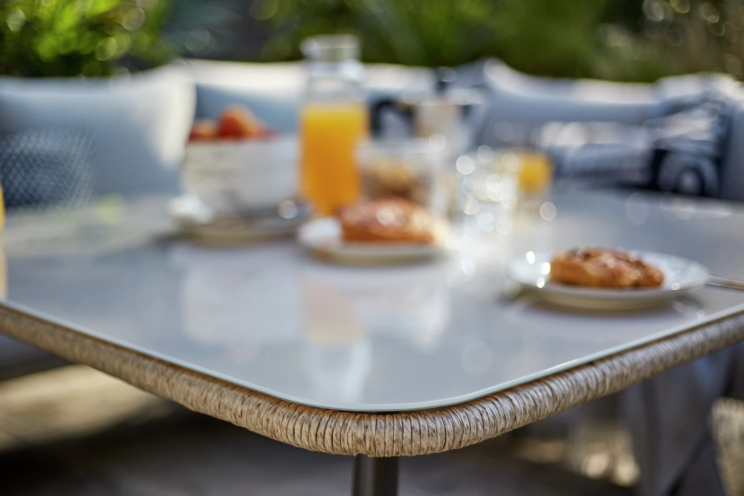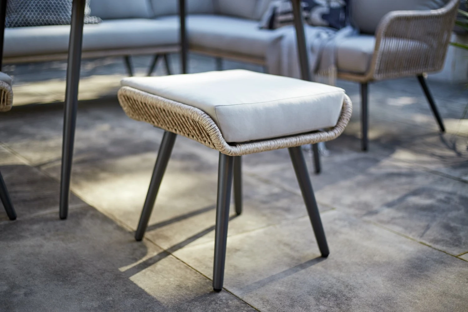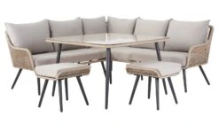 Anddd relax! Entertain outdoors with this comfy number. We love its textured cord finish and smoked glass table top. A socialiser's dream, it includes a 3-seater and 2-seater sofa, configured into a corner unit, as well as 2 smart stools. Transform your garden into an elegant sanctuary with Malta.