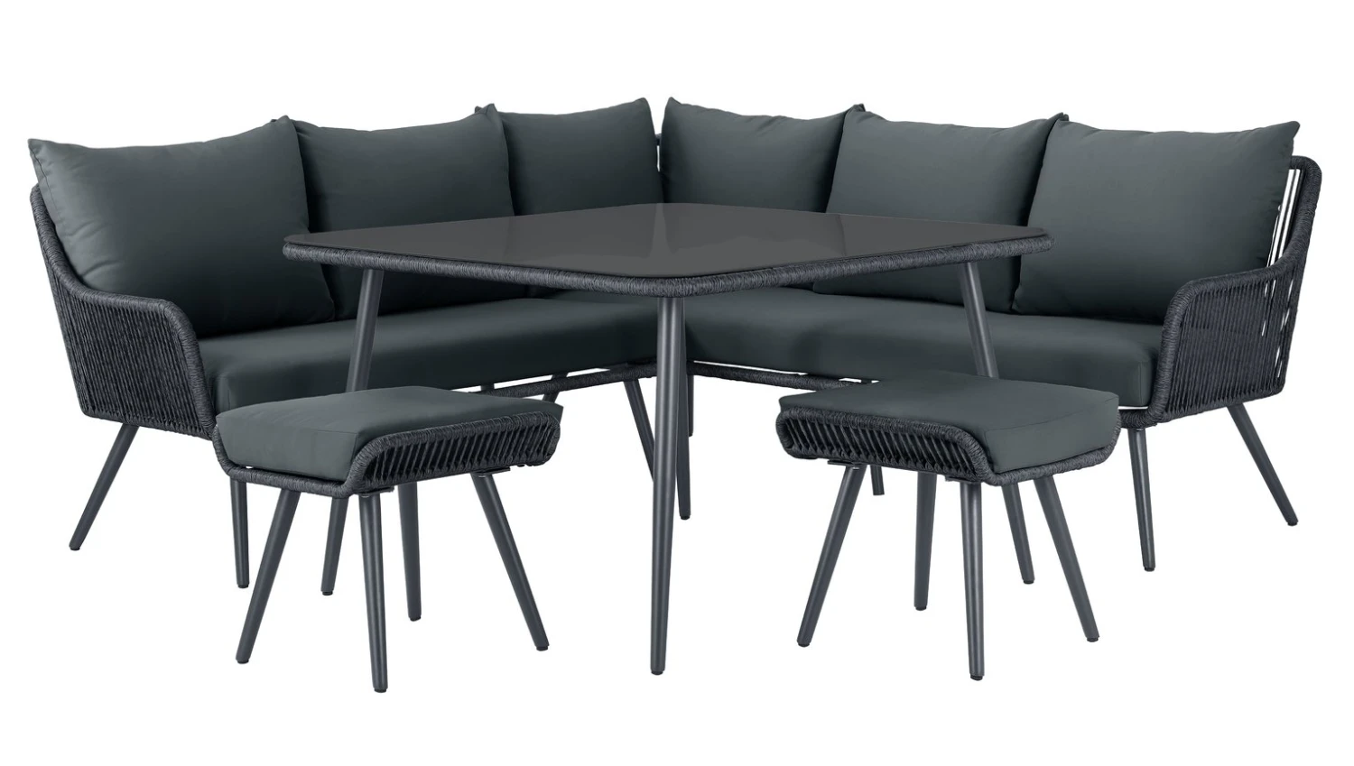 Get garden party ready with our 6-person dining set in jet black. Relax on the 6-seater corner sofa and pull up this pair of nifty stools. Lipped edges mean no slip-sliding around for seat pads. Serving up a feast? Gather round this smart, glass-topped table. Removable legs mean it's simple to store, too. Rattan-effect rope and steel frames make each piece strong, lightweight and easy to move about. The 10 cool grey cushions add to the comfort factor. So, grab a glass of Pimms and settle in. Summer, we're ready for you.