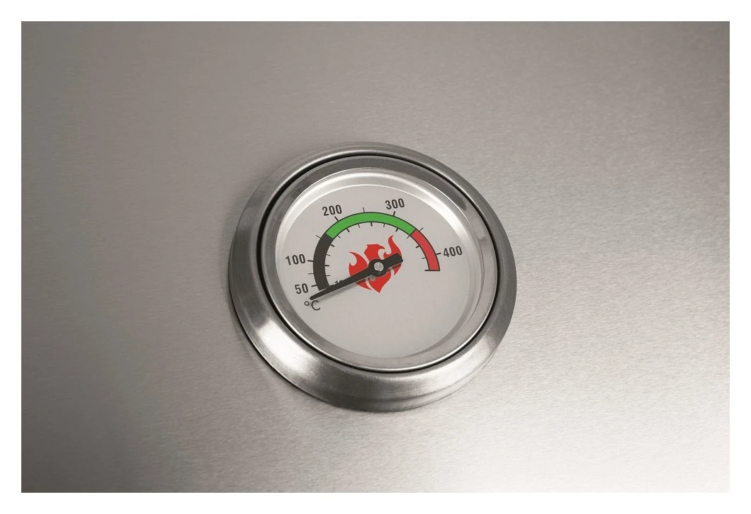 Powerful e-grill cart with touch display for digital temperature display which can be set up to 300C in 50C increments and monitors the temperature in the cooking chamber. The BBQ comes complete with 2 enamelled cast-iron racks with an overall grill surface of approx. 59 x 40.5cm for up to 6 people and extra warming rack made of enamelled steel. High-quality design with panels, handles, lid and housing made of stainless-steell along with two folding side tables to save storage space and 4 locakable castors.