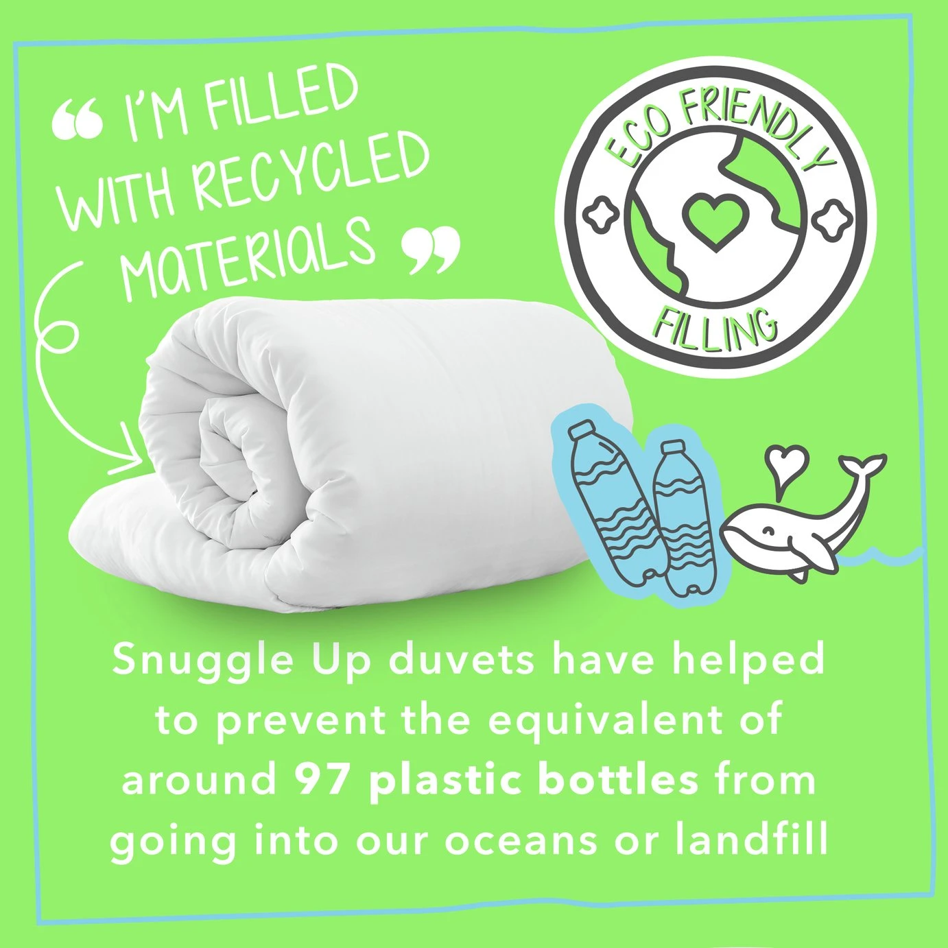 Cosy up and enjoy snoozy snuggles. The Snuggle Up duvet is made with soft covers and filled with oodles of squidgy fibres, keeping you super cosy all-night long, the perfect snuggle partner for chilly winter nights! The duvet is filled with recycled materials giving our lovely planet a helping hand. We care so you can be carefree, the squidgy fibres were once plastic bottles that have experienced a wonderful makeover. Our packaging is made from 30% recycled materials and can be fully recycled.